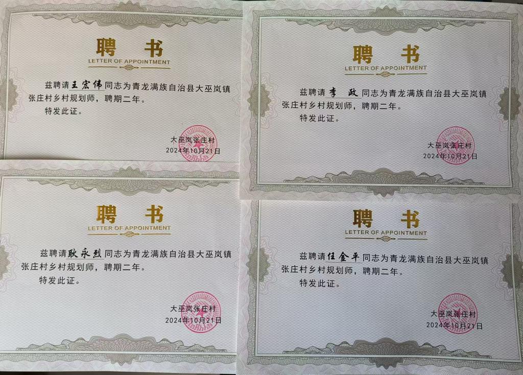同时,在城建学院前期入村开展乡村规划建设帮扶的基础上,张庄村村委向学院李政院长等4人颁发了乡村规划师的聘书,聘期为二年。城建学院将继续发挥专业优势,积极帮扶张庄村推进产业发展和美丽乡村建设。(编辑:鲁艳丽,审核:刘志飞)