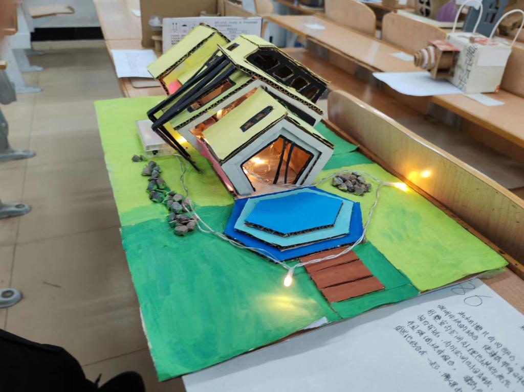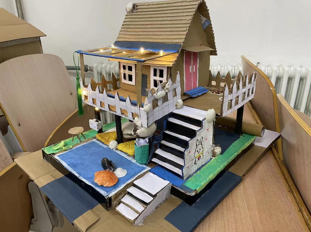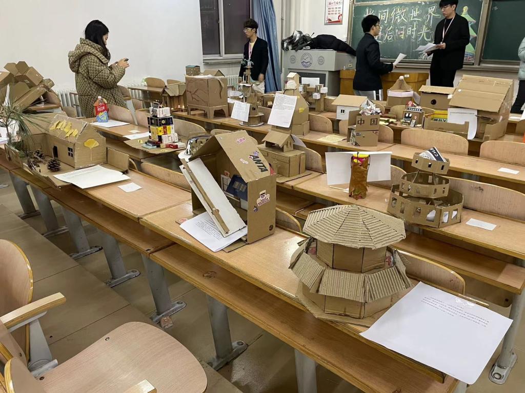 在展览现场,同学们有用废旧纸壳搭建一座座建筑:有天安门、有天坛、明珠塔.......这些作品无一不体现出废物也能变为宝的理念,同时也展现出了同学们的无限创意。